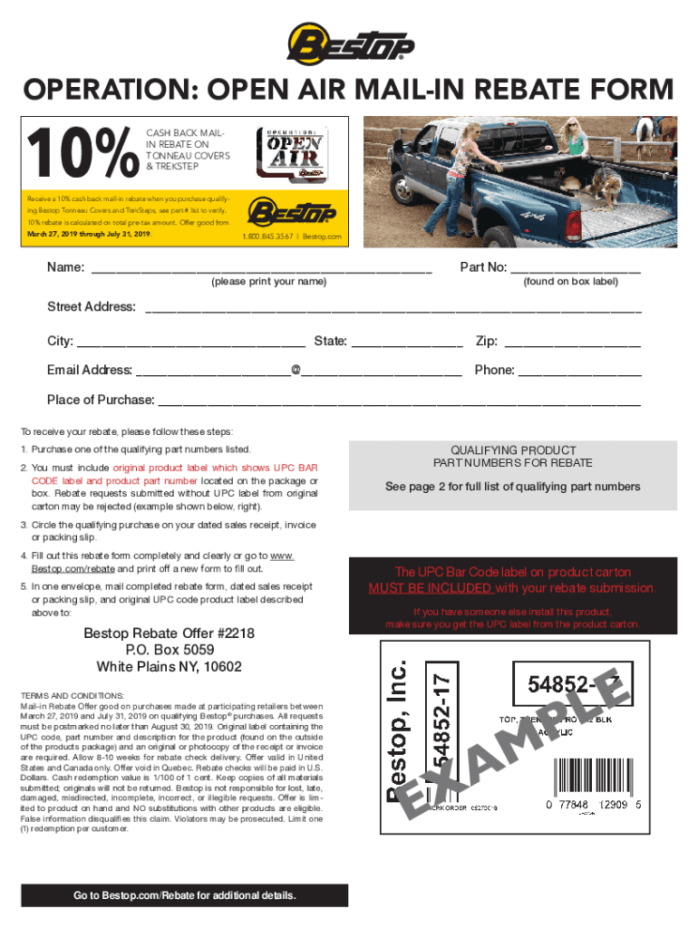 OPERATION: OPEN AIR MAILING REBATE FORM10%CASH BACK MAILING REBATE ON TONNE AU COVERS & TREKSTEPReceive a 10% cash back mailing rebate when you purchase qualifying Bestow Tonne Covers and Trustees,