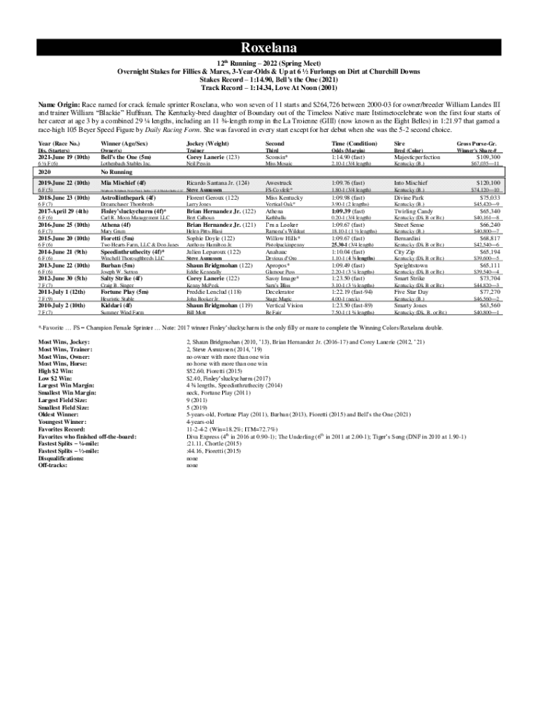 Roseland 12 Running 2022 (Spring Meet) Overnight Stakes for Fillies & Mares, 3YearOlds & Up at 6 Furlongs on Dirt at Churchill Downs Stakes Record 1:14.90, Bells the One (2021) Track Record 1:14.34,