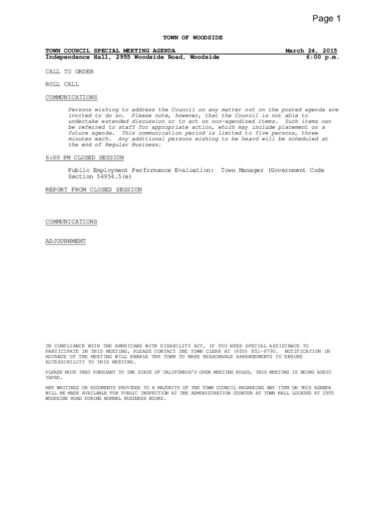 Page 1 TOWN OF WOODSIDE TOWN COUNCIL SPECIAL MEETING AGENDA Independence Hall, 2955 Woodside Road, WoodsideMarch 24, 2015 6:00 p.m.CALL TO ORDER ROLL CALL COMMUNICATIONS Persons wishing to address