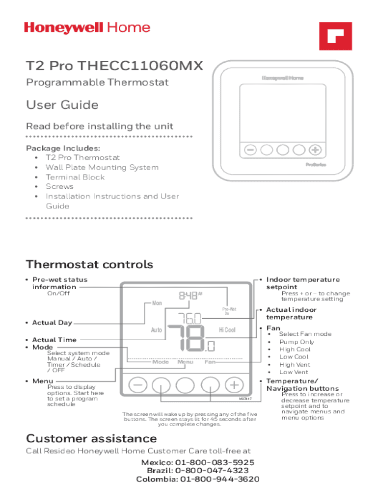 T2 Pro THECC11060MX Programmable Thermostats Guide Read before installing the unit Package Includes: T2 Pro Thermostat Wall Plate Mounting System Terminal Block Screws Installation Instructions and