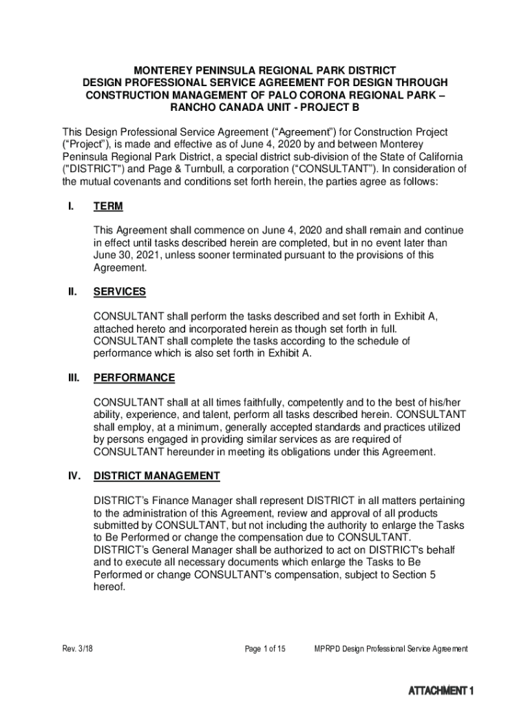 MONTEREY PENINSULA REGIONAL PARK DISTRICT DESIGN PROFESSIONAL SERVICE AGREEMENT FOR DESIGN THROUGH CONSTRUCTION MANAGEMENT OF PALE CORONA REGIONAL PARK RANCHO CANADA UNIT PROJECT B This Design Professional