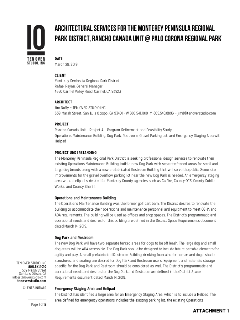 ARCHITECTURAL SERVICES FOR THE MONTEREY PENINSULA REGIONAL PARK DISTRICT, Rancho Canada unit @ pale corona regional park DATE March 29, 2019, CLIENT Monterey Peninsula Regional Park District Rafael
