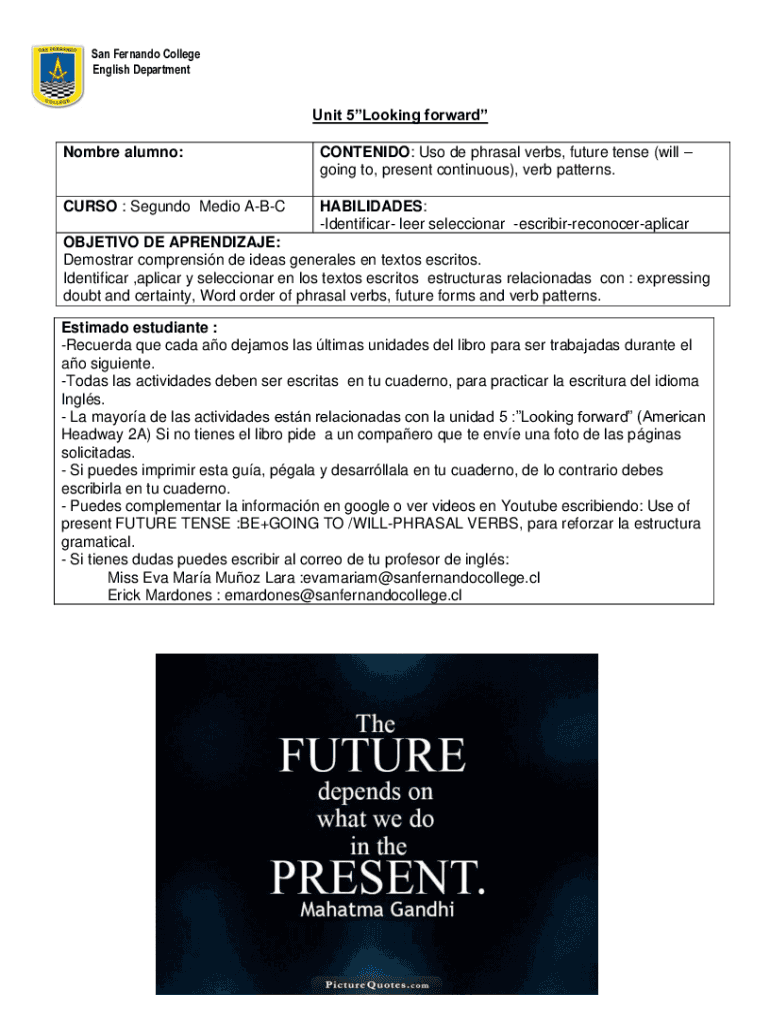 San Fernando College English DepartmentUnit 5Looking forward Hombre alumni:CONTEND: Us ode phrasal verbs, future tense (will going to, present continuous), verb patterns. CURSE : Segundo Media ABCHABILIDADES: