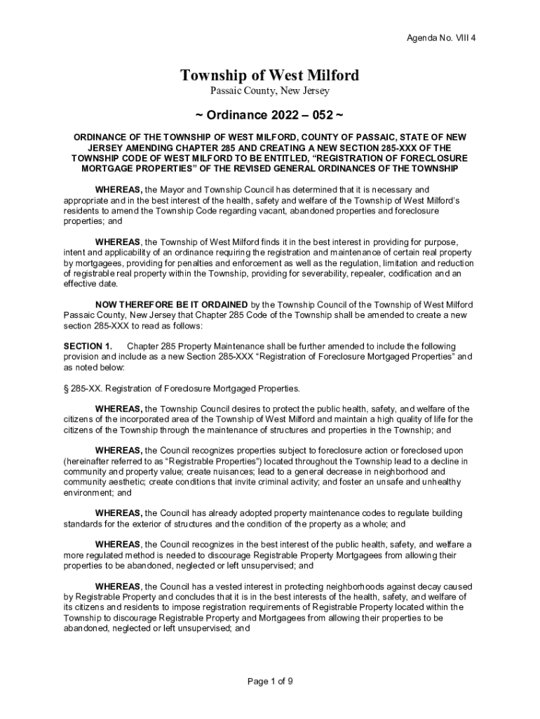 Agenda No. VIII 4Township of West Milford Passaic County, New Jersey Ordinance 2022 052 ORDINANCE OF THE TOWNSHIP OF WEST MILFORD, COUNTY OF PASSAIC, STATE OF NEW JERSEY AMENDING CHAPTER 285 AND CREATING