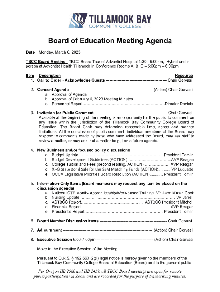 Board of Education Meeting Agenda Date: Monday, March 6, 2023, TBC Board Meeting TBC Board Tour of Adventist Hospital 4:30 5:00pm, Hybrid and in person at Adventist Health Billhook in Conference Rooms