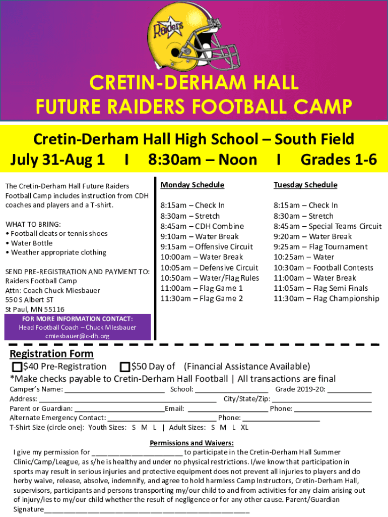 CRETINDERHAM HALL FUTURE RAIDERS FOOTBALL CAMP CretinDerham Hall High School South Field July 31Aug 1 I 8:30am Noon I Grade 16 The CretinDerham Hall Future Raiders Football Camp includes instruction