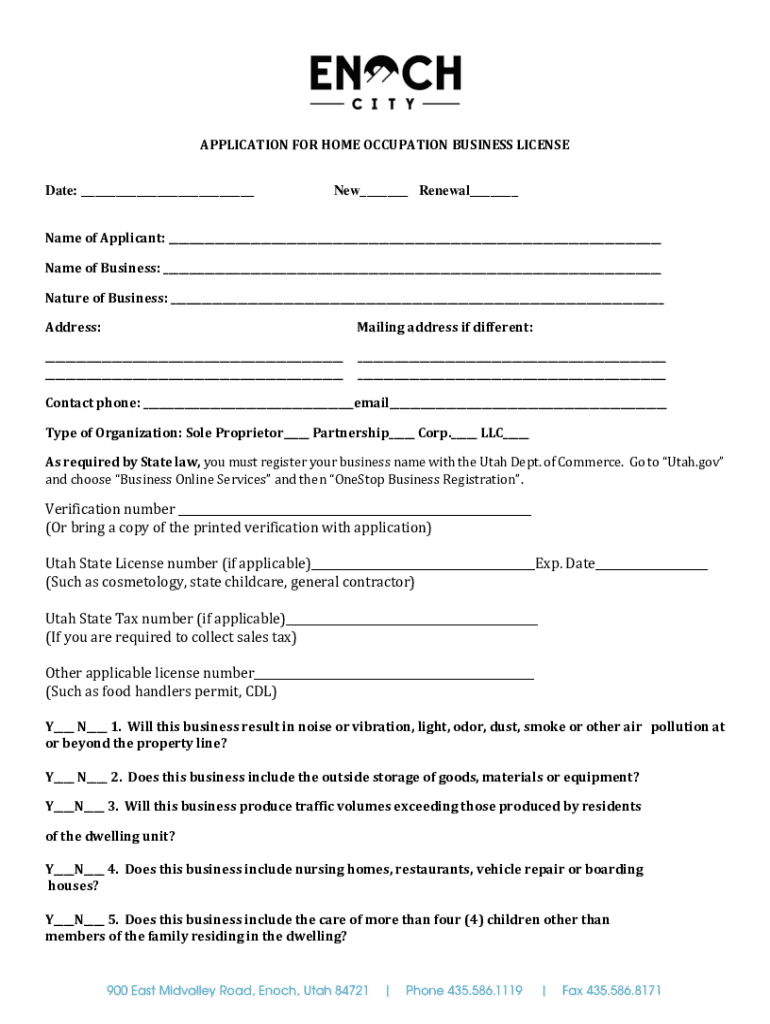 APPLICATION FOR HOME OCCUPATION BUSINESS LICENSE Date: ___New___ Renewal___Name of Applicant: ___ Name of Business: ___ Nature of Business: ___ Address:Mailing address if different:___ ______ ___Contact