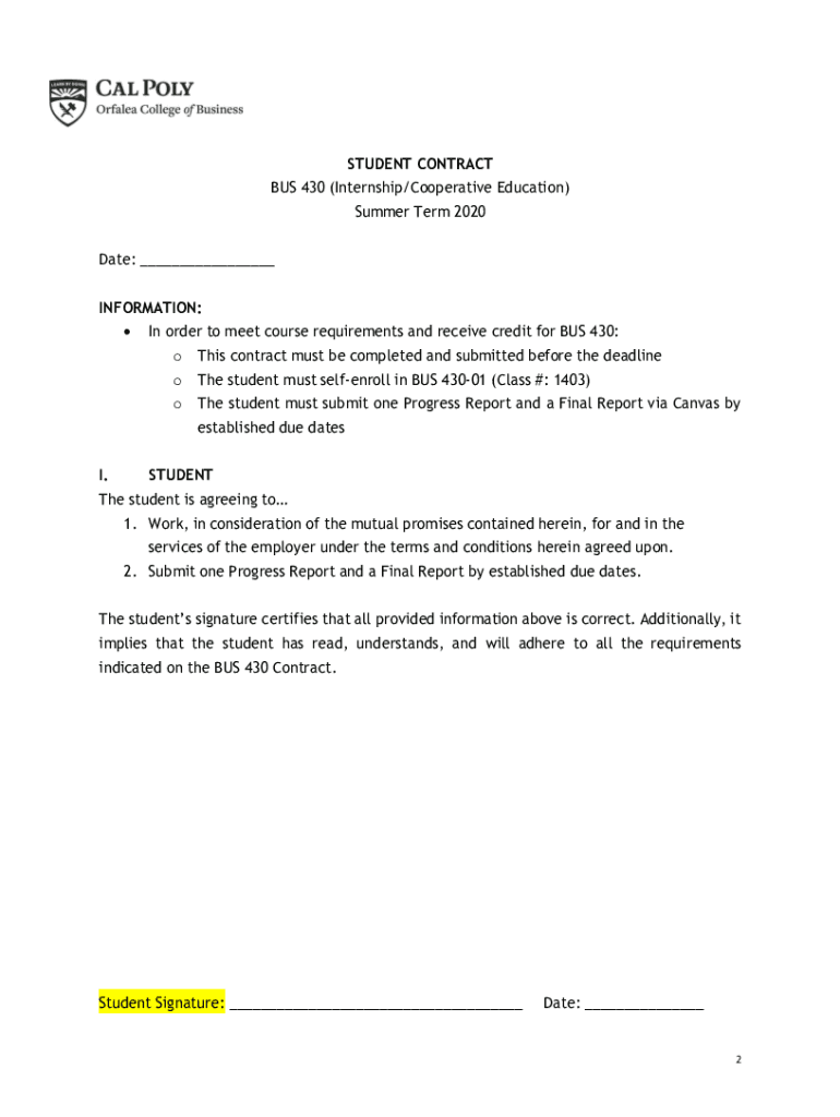 Student Services Orphaned College of Business Office: 8057562601 cobadvis@calpoly.edu cob.calpoly.edu/studentservicesINSTRUCTION DOCUMENT BUS 430 (Internship/Cooperative Education) Summer Term 2020