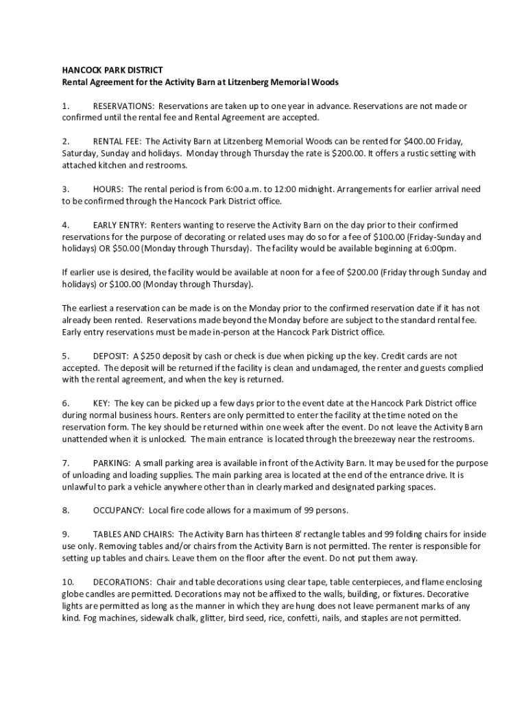 HANCOCK PARK DISTRICT Rental Agreement for the Activity Barn at Wittenberg Memorial Woods 1. RESERVATIONS: Reservations are taken up to one year in advance. Reservations are not made or confirmed