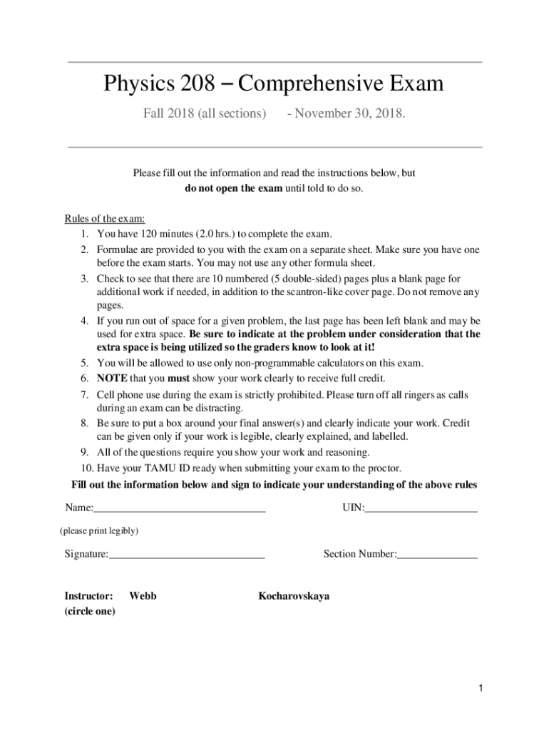 Physics 208 Comprehensive Exam Fall 2018 (all sections) November 30, 2018. Please fill out the information and read the instructions below, but do not open the exam until told to do so. Rules of the