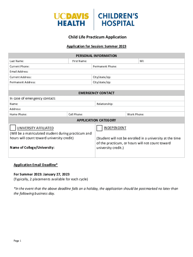 Child Life Practicum Application for Session: Summer 2023 PERSONAL INFORMATION Last Name:MI:First Name:Current Phone:Permanent Phone:Email Address: Current Address:City/state/zip:Permanent Address:City/state/zip:EMERGENCY