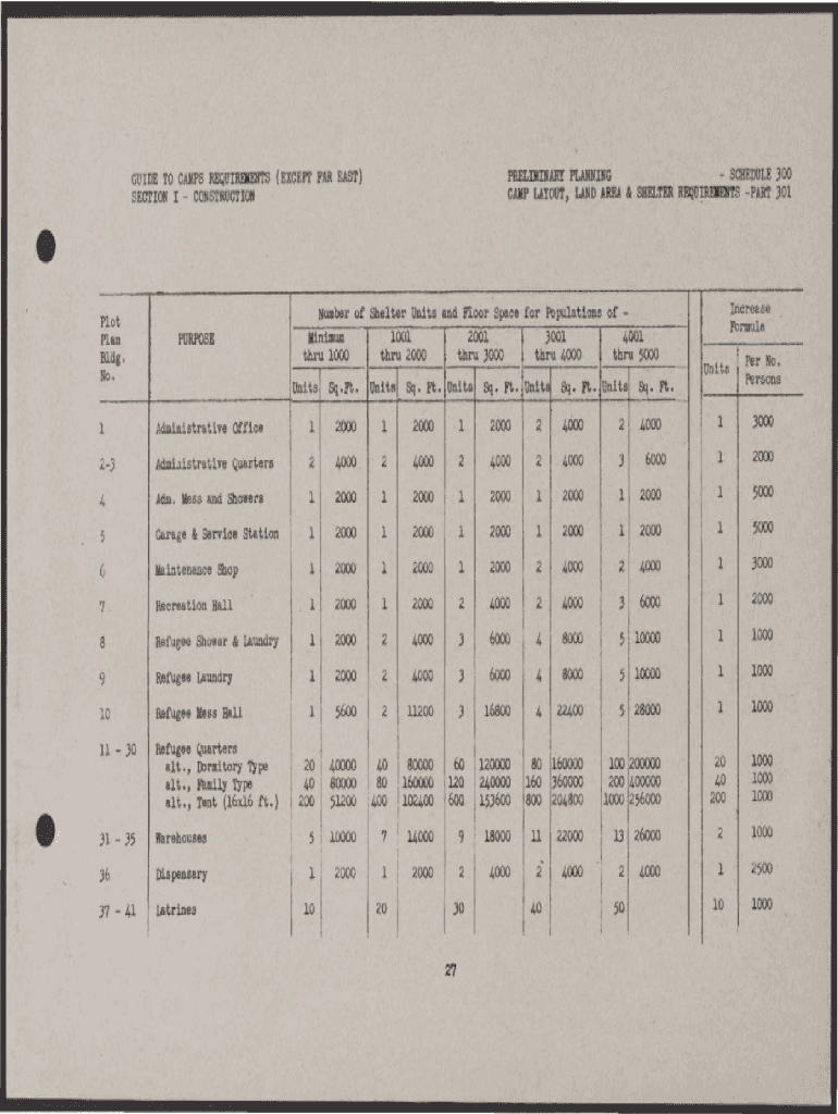 PRELIMINARY PLANNINGGUIDE TO CAMPS Requirements EXCEPT\' FAR EAST) SECTION I Constructional Plan Bldg. No. Number of Shelter Units and Floor Space for. Populations of 1001 2001 4001 Minimum .3001