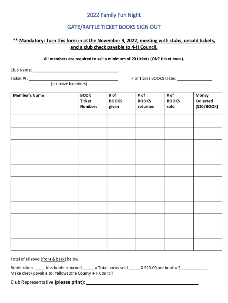 2022 Family Fun Night GATE/RAFFLE TICKET BOOK PROCEDURE 1. Gate/Raffle Ticket Books. Ticket books must be closely controlled! Stress to the members that they are responsible for the ticket books signed