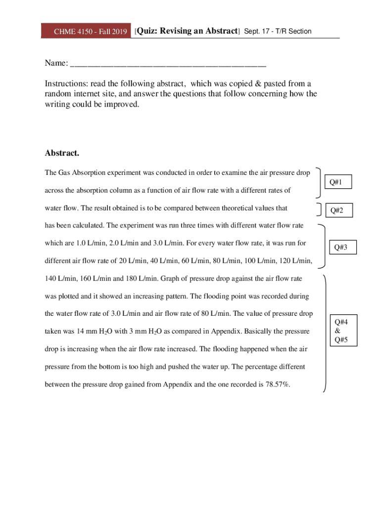 COME 4150 Fall 2019 [Quiz: Revising an Abstract] Sept. 17 T/R Sectional: ___ Instructions: read the following abstract, which was copied & pasted from a random internet site, and answer the questions