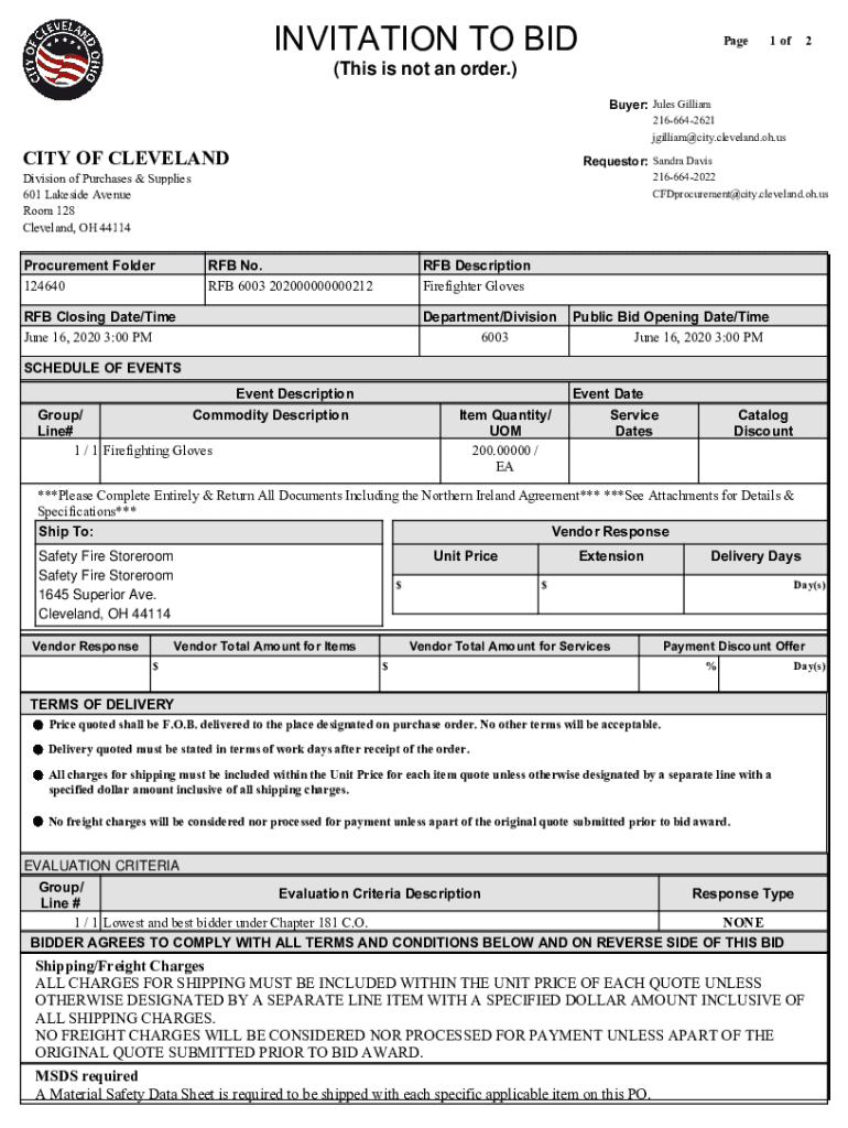 INVITATION TO BIDPage1 of2(This is not an order.) Buyer: Jules Gilliam 2166642621 jgilliam@city.cleveland.oh.usCITY OF CLEVELANDRequestor: Sandra Davis 2166642022 CFDprocurement@city.cleveland.oh.usDivision