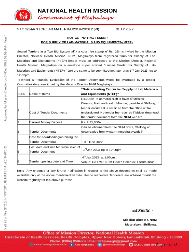 Approved by Mission Director on 01Dec2022 09:09 AM Page 1STO.3/14/ROTC/LAB MATERIAL/201920/012 (VI)01.12.2022NOTICE INVITING TENDER FOR SUPPLY OF MATERIALS AND EQUIPMENTS(STEP) Sealed Tenders in a