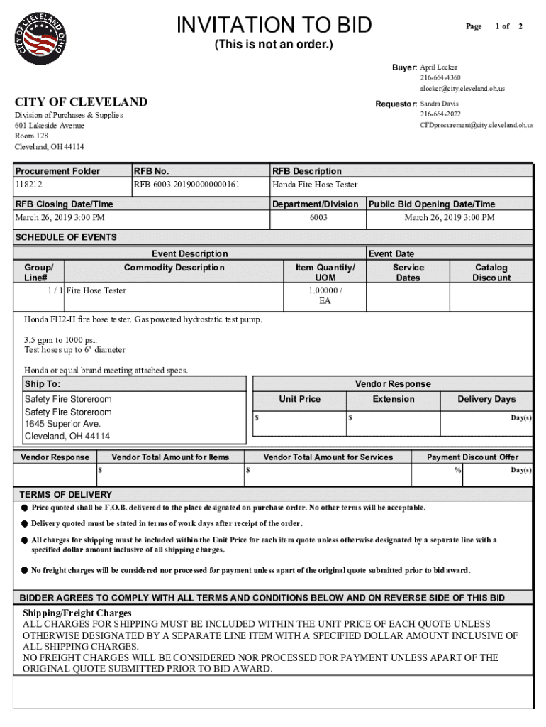INVITATION TO BIDPage1 of2(This is not an order.) Buyer: April Locker 2166644360 alocker@city.cleveland.oh.usCITY OF CLEVELANDRequestor: Sandra Davis 2166642022 CFDprocurement@city.cleveland.oh.usDivision
