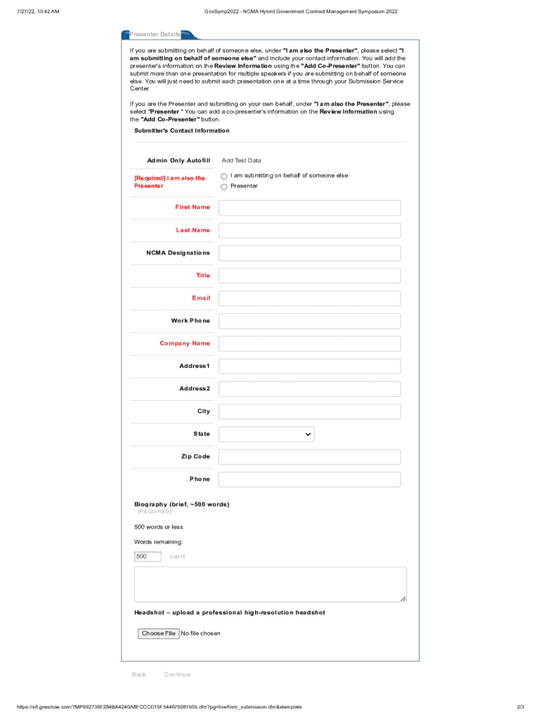 7/27/22, 10:42 AMGovSymp2022 NCAA Hybrid Government Contract Management Symposium 2022Presenter Details If you are submitting on behalf of someone else, under \” I am also the Presenter\”, please