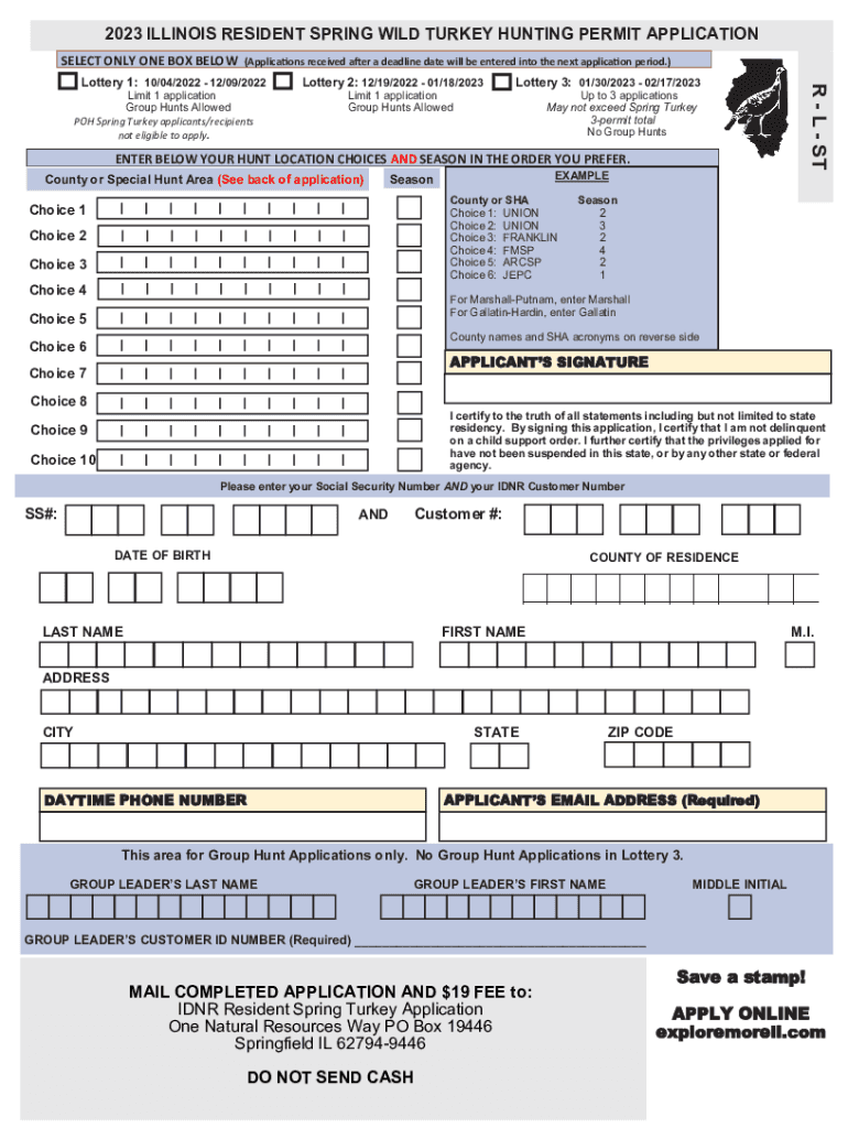 2023 ILLINOIS RESIDENT SPRING WILD TURKEY HUNTING PERMIT APPLICATION SELECT ONLY ONE BOX BELOW (Applications received after a deadline date will be entered into the next application period.) Limit