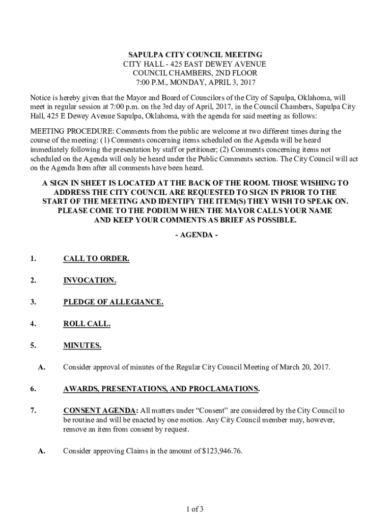 SAPULPA CITY COUNCIL MEETING CITY HALL 425 EAST DEWEY AVENUE COUNCIL CHAMBERS, 2ND FLOOR 7:00 P.M., MONDAY, APRIL 3, 2017, Notice is hereby given that the Mayor and Board of Councilors of the City
