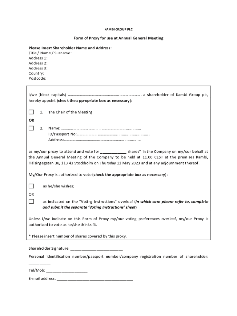 BAMBI GROUP Perform of Proxy for use at Annual General Meeting Please Insert Shareholder Name and Address: Title / Name / Surname: Address 1: Address 2: Address 3: Country: Postcode:I/we (block capitals).