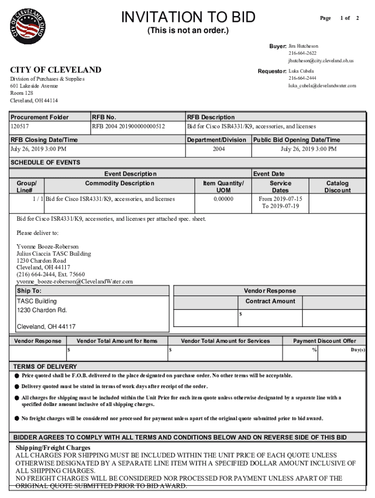 INVITATION TO BIDPage1 of2(This is not an order.) Buyer: Jim Hutches on 2166642622 jhutcheson@city.cleveland.oh.usCITY OF CLEVELANDRequestor: Luka Cube la 2166642444 luka_cubela@clevelandwater.comDivision