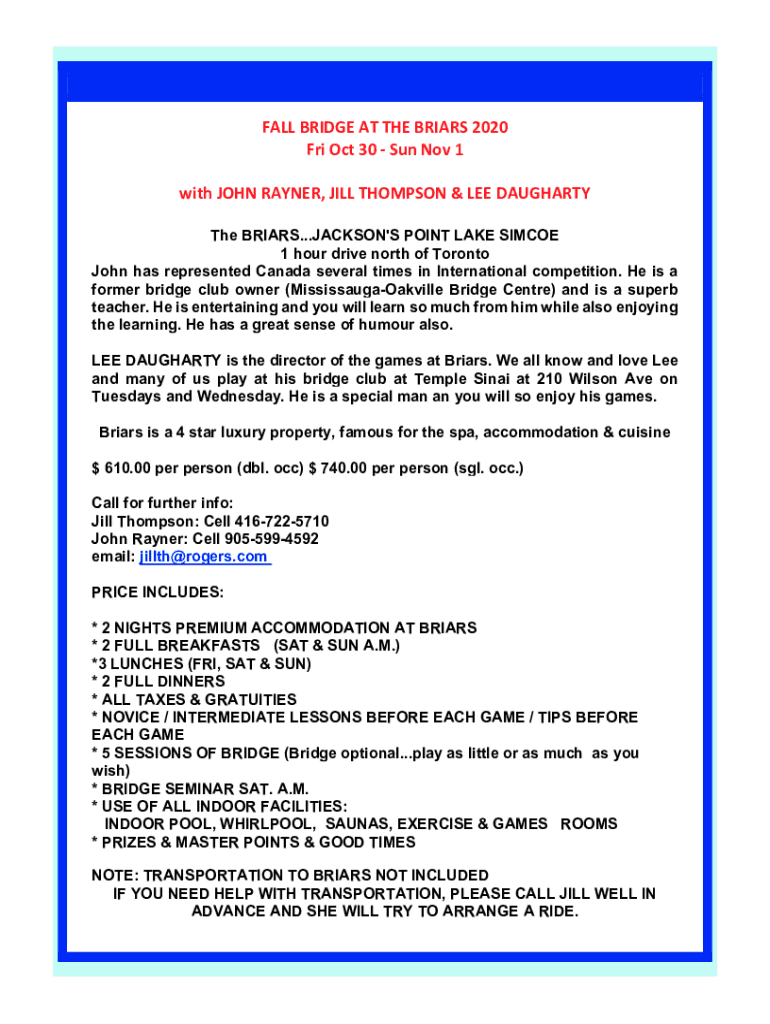 FALL BRIDGE AT THE FRIARS 2020 Fri Oct 30 Sun Nov 1 with JOHN RAY NER, JILL THOMPSON & LEE DAUGHERTY The FRIARS...JACKSON\'S POINT LAKE SIM COE 1-hour drive north of Toronto John has represented Canada