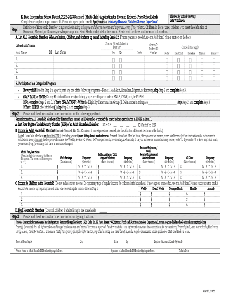 El Paso Independent School District, 20222023 Standard (Multiplied) Application for Free and Reduced Price School Megalithic Box for School Use Only. Date Withdrawn: Complete one application per household.