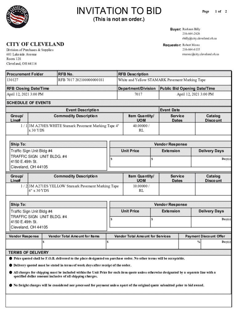 INVITATION TO BIDPage1 of2(This is not an order.) Buyer: Rashawn Billy 2166642626 rbilly@city.cleveland.oh.usCITY OF CLEVELANDRequestor: Robert Maven 2166646135 rmavec@city.cleveland.oh.usDivision