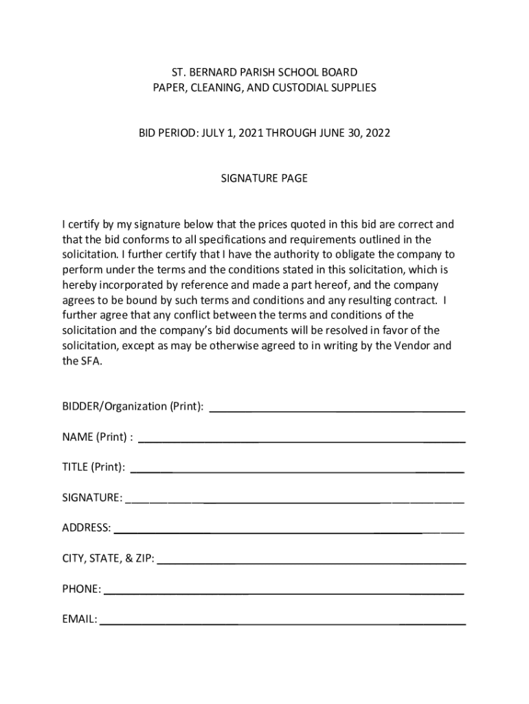 ST. BERNARD PARISH SCHOOL BOARD PAPER, CLEANING, AND CUSTODIAL SUPPLIES BID PERIOD: JULY 1, 2021, THROUGH JUNE 30, 2022SIGNATURE PAGE certify by my signature below that the prices quoted in this bid