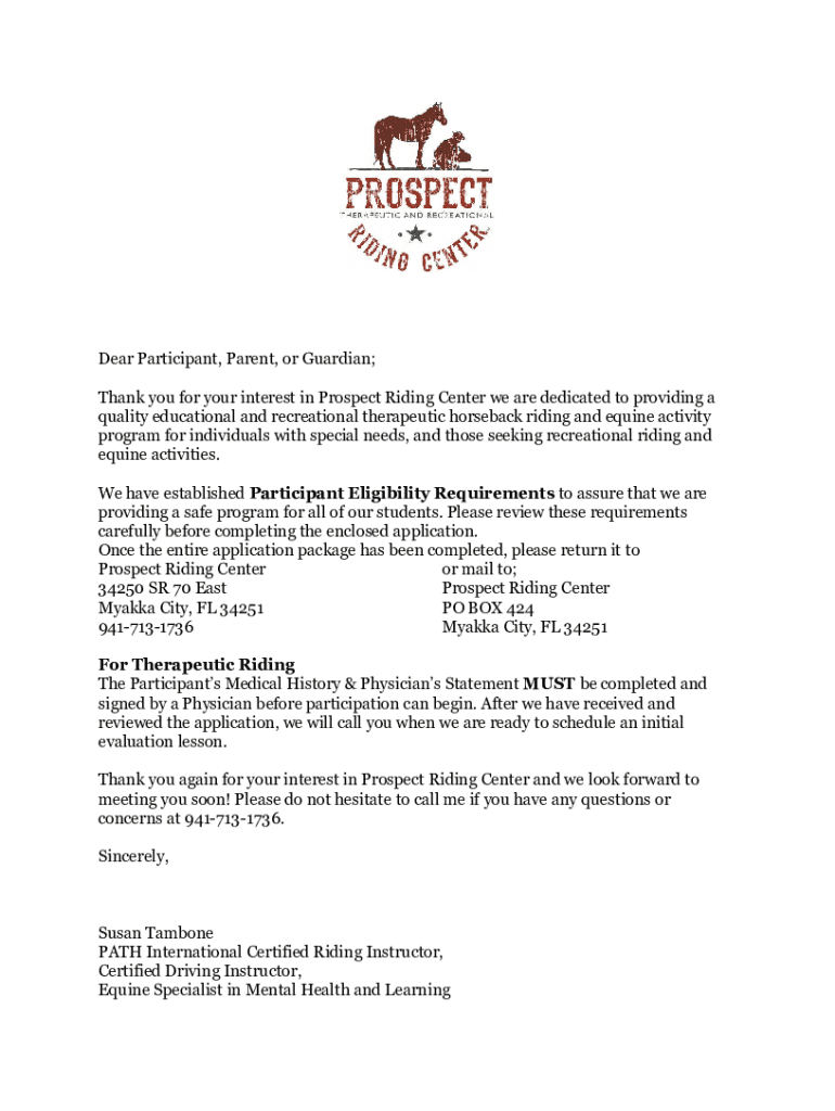 Dear Participant, Parent, or Guardian; Thank you for your interest in Prospect Riding Center we are dedicated to providing a quality educational and recreational therapeutic horseback riding and equine