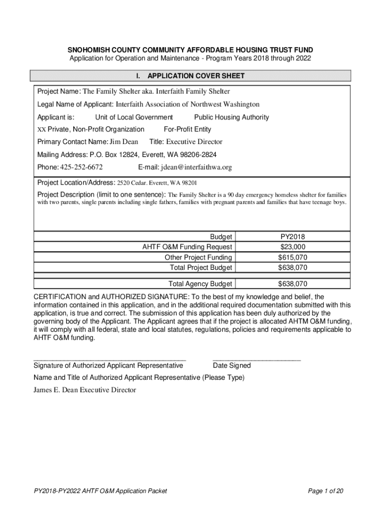 SNOHOMISH COUNTY COMMUNITY AFFORDABLE HOUSING TRUST FUND Application for Operation and Maintenance Program Years 2018 through 2022 I.APPLICATION COVER SHEETProject Name: The Family Shelter aka. Interfaith
