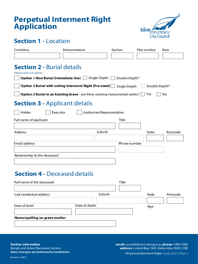 Eligibility for burial in forms can usually be obtained from the cemetery or burial site and must be completed with relevant information about the deceased individual.