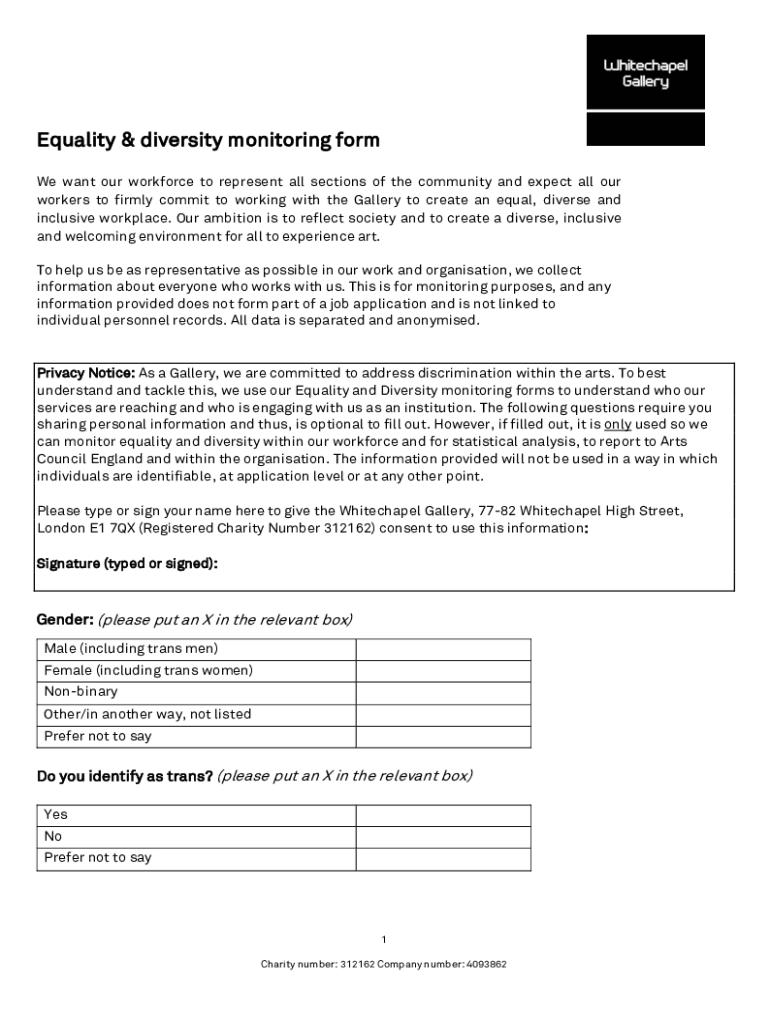 Equality & diversity monitoring form We want our workforce to represent all sections of the community and expect all our workers to firmly commit to working with the Gallery to create an equal, diverse