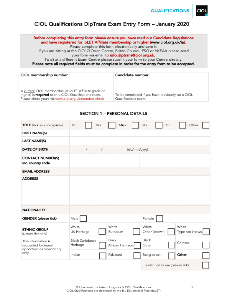 Get the free CIOL Qualifications DipTrans Exam Entry Form