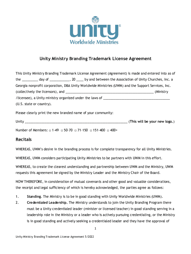 Unity Ministry Branding Trademark License Agreement This Unity Ministry Branding Trademark License Agreement (Agreement) is made and entered into as of the ___ day of ___, 20 ___ by and between the