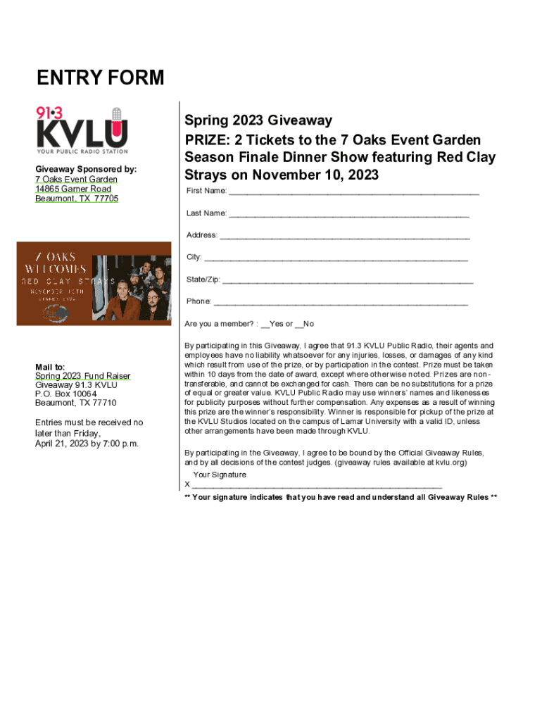 ENTRY FORMGiveaway Sponsored by: 7 Oaks Event Garden 14865 Garner Road Beaumont, TX 77705Spring 2023 Giveaway PRIZE: 2 Tickets to the 7 Oaks Event Garden Season Finale Dinner Show featuring Red Clay