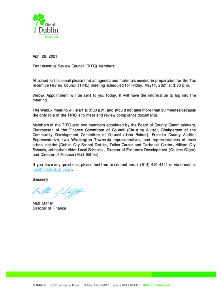 April 28, 2021, Tax Incentive Review Council (TIRE) Members Attached to this email please find an agenda and materials needed in preparation for the Tax Incentive Review Council (TIRE) meeting scheduled