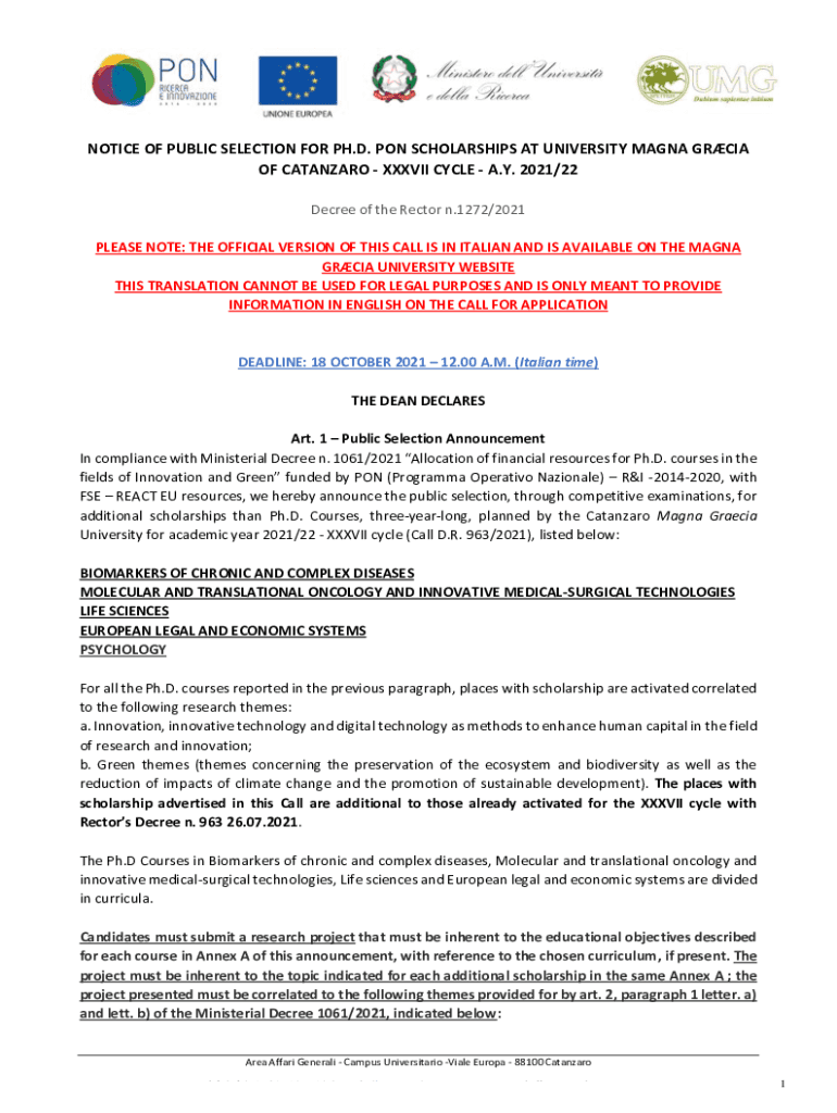 NOTICE OF PUBLIC SELECTION FOR Ph.D. PON SCHOLARSHIPS AT UNIVERSITY MAGMA GARCIA OF CATENARY XXXVII CYCLE A.Y. 2021/22 Decree of the Rector n.1272/2021 PLEASE NOTE: THE OFFICIAL VERSION OF THIS CALL