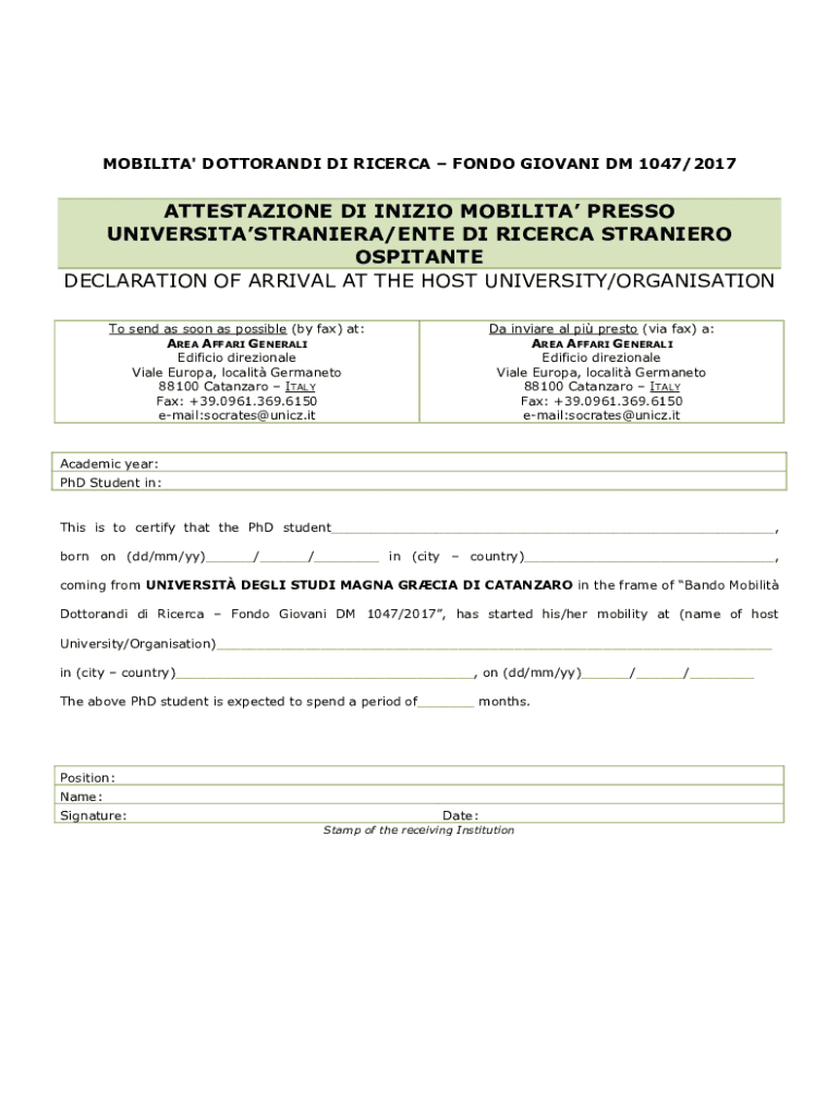 DECLARATION OF ARRIVAL AT THE HOST UNIVERSITY/Organization