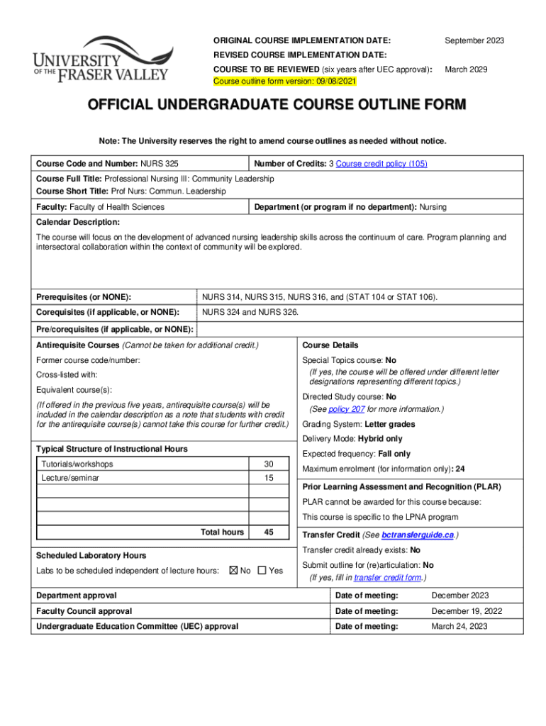 Get the free Nursing (NURS) Course OutlinesUFV Academic Calendar