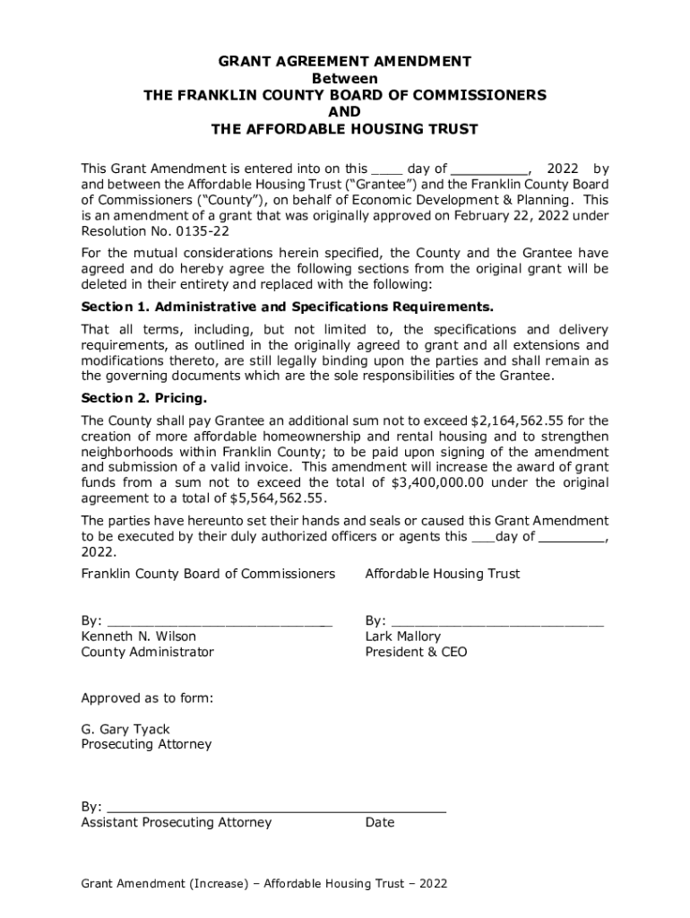 GRANT AGREEMENT AMENDMENT Between THE FRANKLIN COUNTY BOARD OF COMMISSIONERS AND THE AFFORDABLE HOUSING TRUST This Grant Amendment is entered into on this ___ day of, 2022 by and between the Affordable