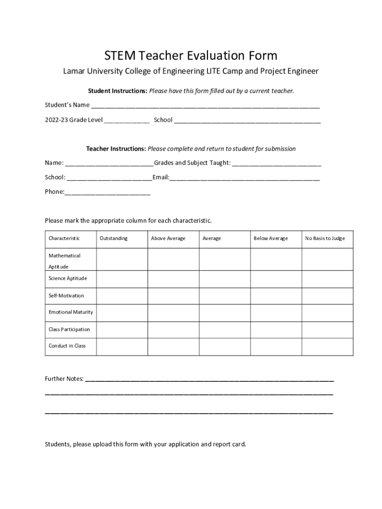 STEM Teacher Evaluation Form Lamar University College of Engineering LITE Camp and Project Engineer Student Instructions: Please have this form filled out by a current teacher. Students Name ___ 202223