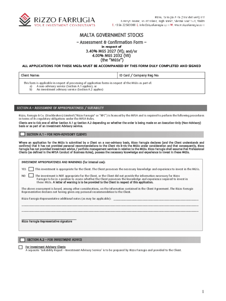 MALTA GOVERNMENT STOCKS Assessment & Confirmation Form in respect of3.40% MGS 2027 (VI); and/or 4.00% MGS 2032 (VII) (the Mass) ALL APPLICATIONS FOR THESE Mass MUST BE ACCOMPANIED BY THIS FORM DULY