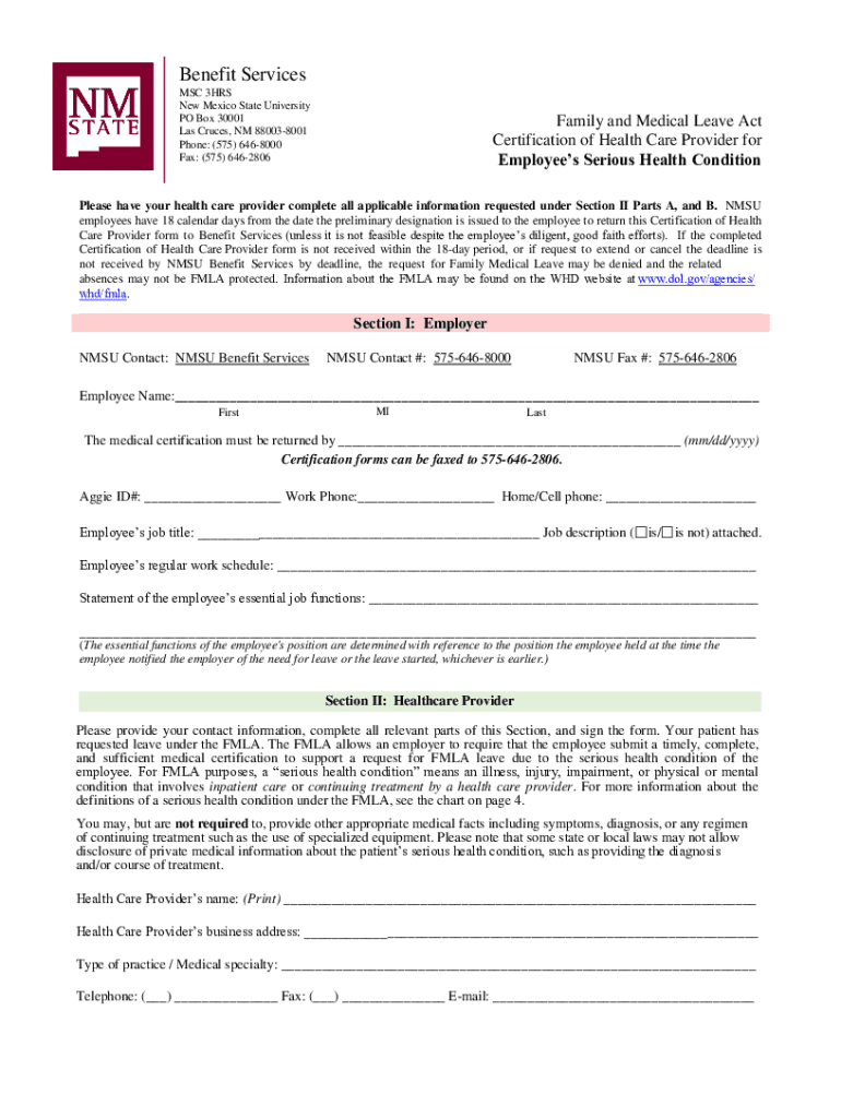 Benefit Services MSC 3HRS New Mexico State University PO Box 30001 Las Cruces, NM 880038001 Phone: (575) 6468000 Fax: (575) 6462806Family and Medical Leave Act Certification of Health Care Provider