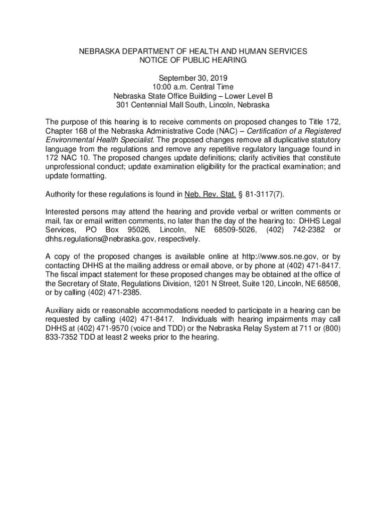 NEBRASKA DEPARTMENT OF HEALTH AND HUMAN SERVICES NOTICE OF PUBLIC HEARING September 30, 2019 10:00 a.m. Central Time Nebraska State Office Building Lower Level B 301 Centennial Mall South, Lincoln,