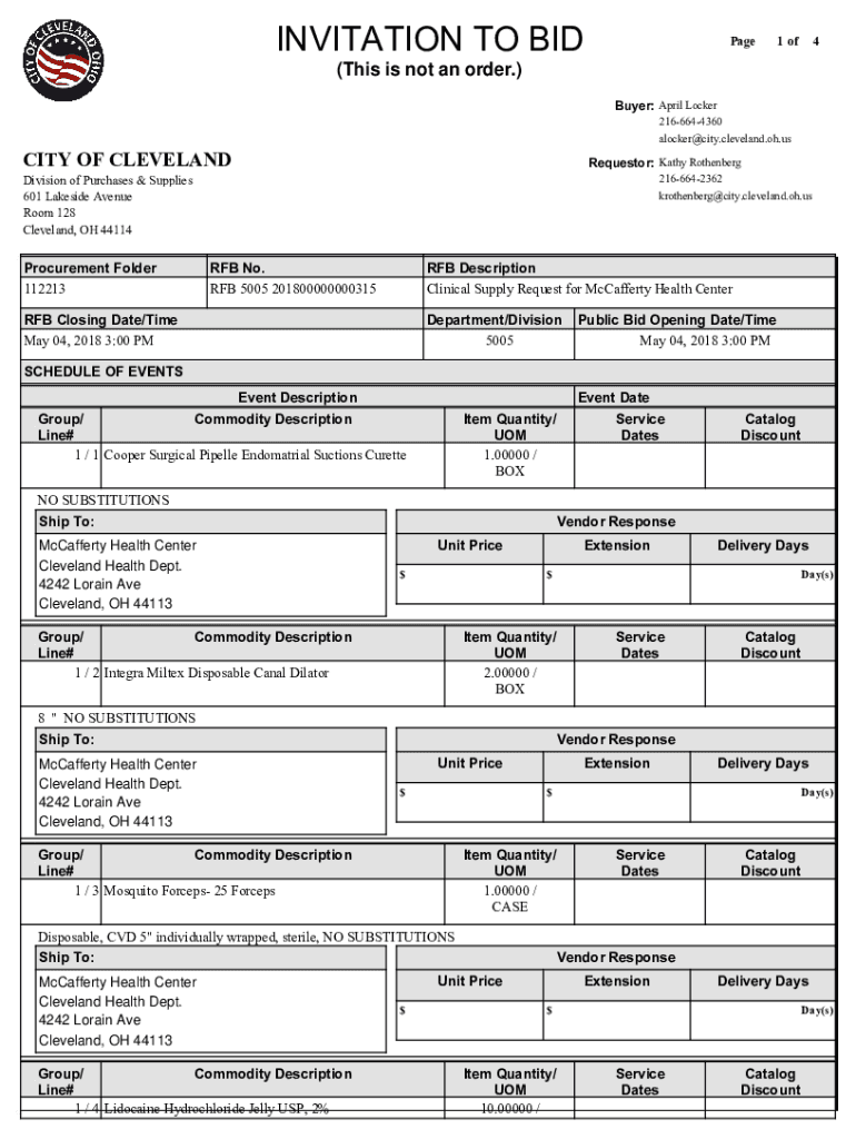 INVITATION TO BIDPage1 of4(This is not an order.) Buyer: April Locker 2166644360 alocker@city.cleveland.oh.usCITY OF CLEVELANDRequestor: Kathy Rosenberg 2166642362 krothenberg@city.cleveland.oh.usDivision