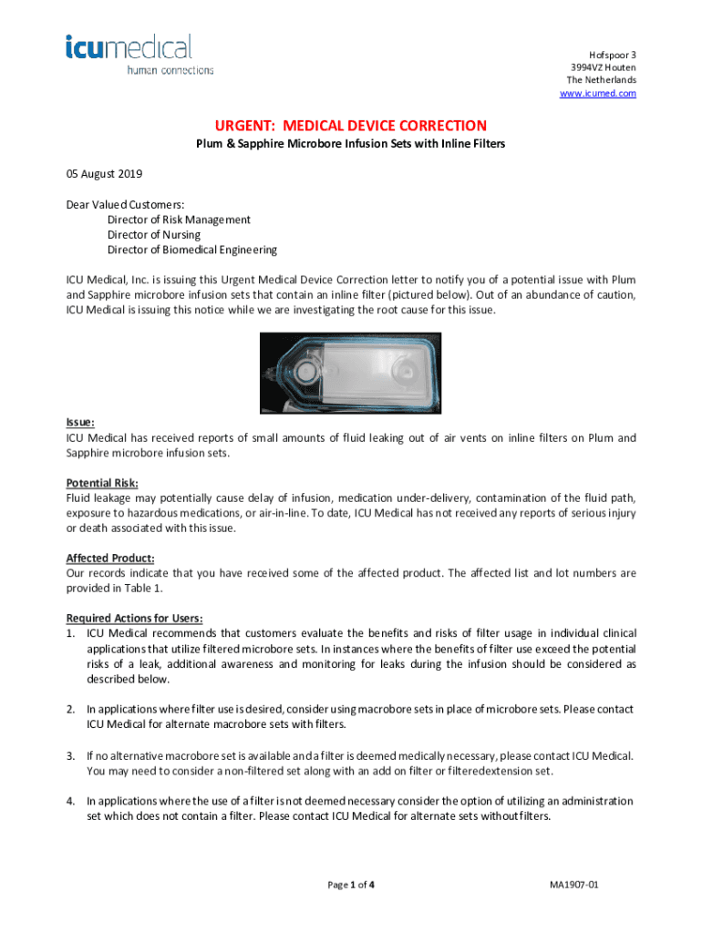 Phosphor 3 3994VZ Often The Netherlands www.icumed.comURGENT: MEDICAL DEVICE Correctional & Sapphire Micropore Infusion Sets with Inline Filters 05 August 2019 Dear Valued Customers: Director of Risk