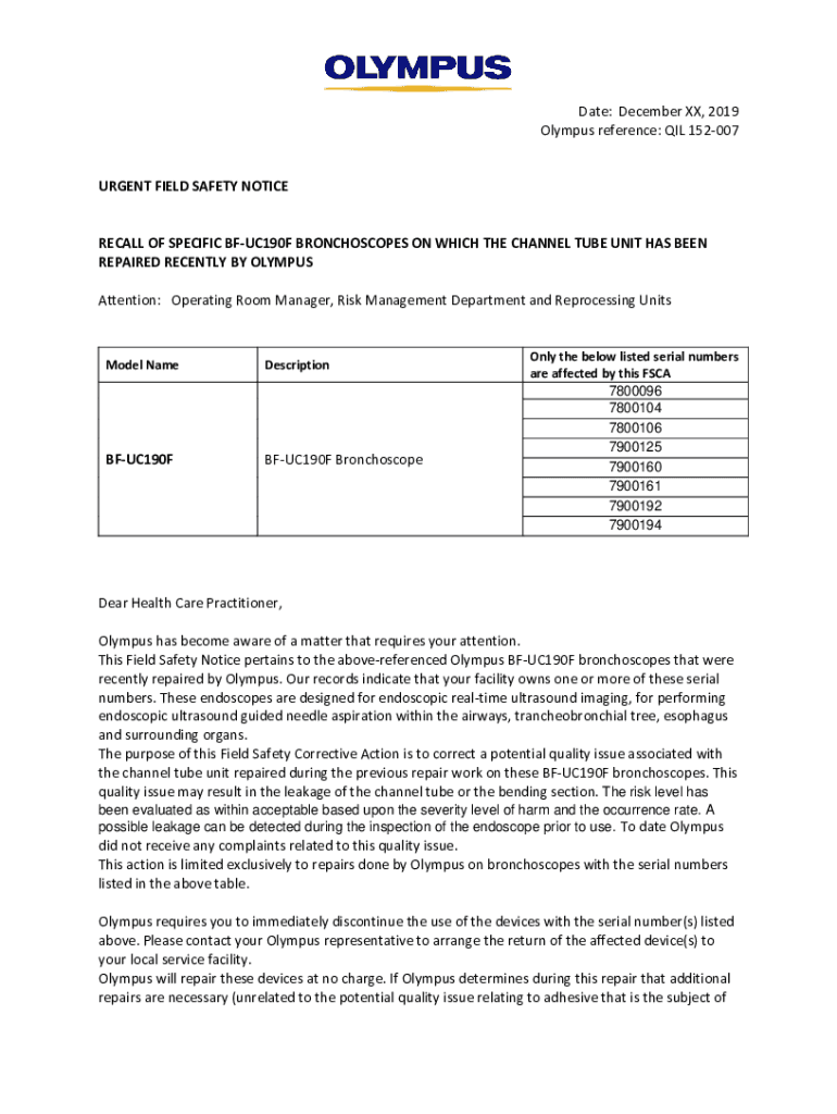 Olympus reference: OIL 152007URGENT FIELD SAFETY NOTICERECALL OF SPECIFIC BFUC190F BRONCHOSCOPES ON WHICH THE CHANNEL Tubes UNIT HAS BEEN