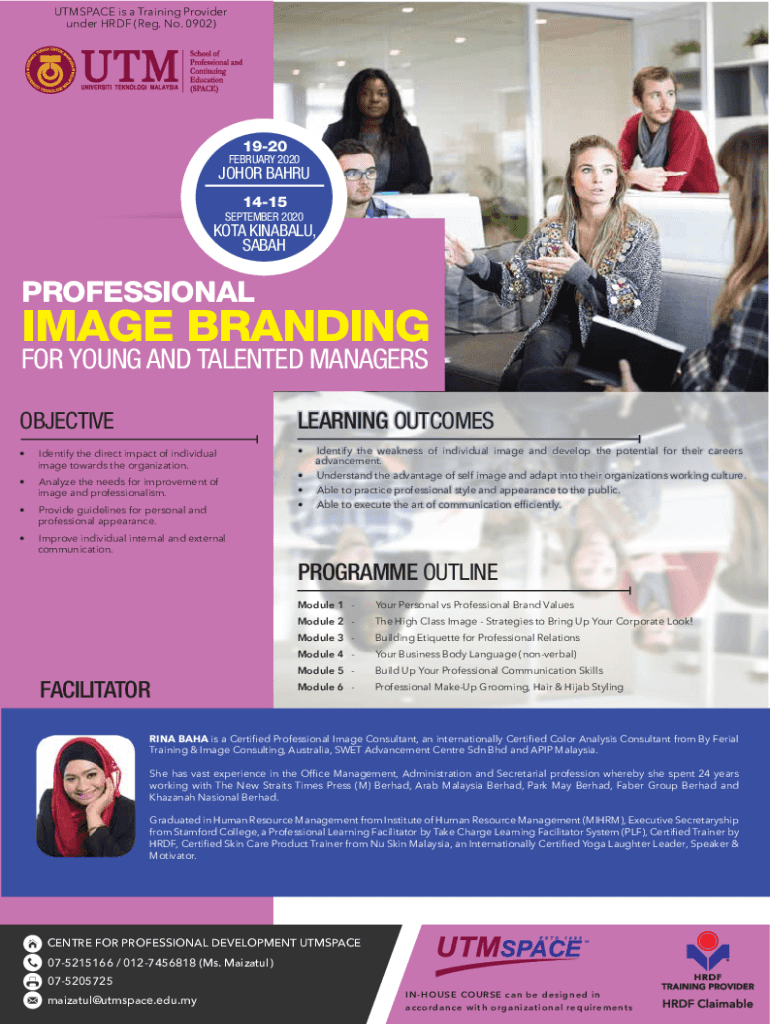 SPACE is a Training Provider under HDF (Reg. No. 0902)1920FEBRUARY 2020JOHOR BAH RU 1415 SEPTEMBER 2020KOTA PINBALL, SABAHPROFESSIONALIMAGE BRANDING YOUNG AND TALENTED MANAGERS OBJECTIVELEARNING OUTCOMESIdentify
